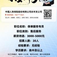招聘 保单售后服务专员,宝妈也能做经验年龄要求:无经验,20到50周岁工资:工薪2500-5000+职位描述:①工作时长固定:5+5工作模式,每周