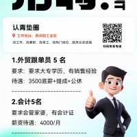 招聘 报价接单员+文员 8名职位要求:有1年以上的相关紧固件工作经验,有较强的责任心,已婚男女优先。薪酬福利:月薪 3K-5K工作地址:东
