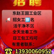 招聘 招聘:女工3名,标准件的活干净不沉,全天坐着工作,日工包工均可,有意者联系,只要东赵王固工业区附近的人。
