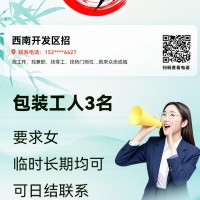 招聘 西南开发区招包装工人3名 要求女临时长期均可 可日结联系