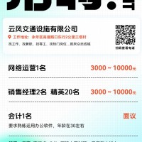 招聘 云风交通设施有限公司招聘:岗位:网络运营1名薪资:底薪+高提成+公休+团建,月薪3000~10000,待遇:上不封顶,只要有上进心,