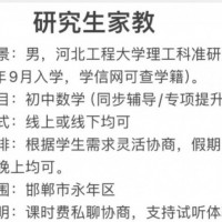 教育培训 研究生家教身份背景:男,河北工程大学理工科准研究生(2025年9月入学,学信网可查学籍)。辅导科目:初中数学(同步辅导/专项提