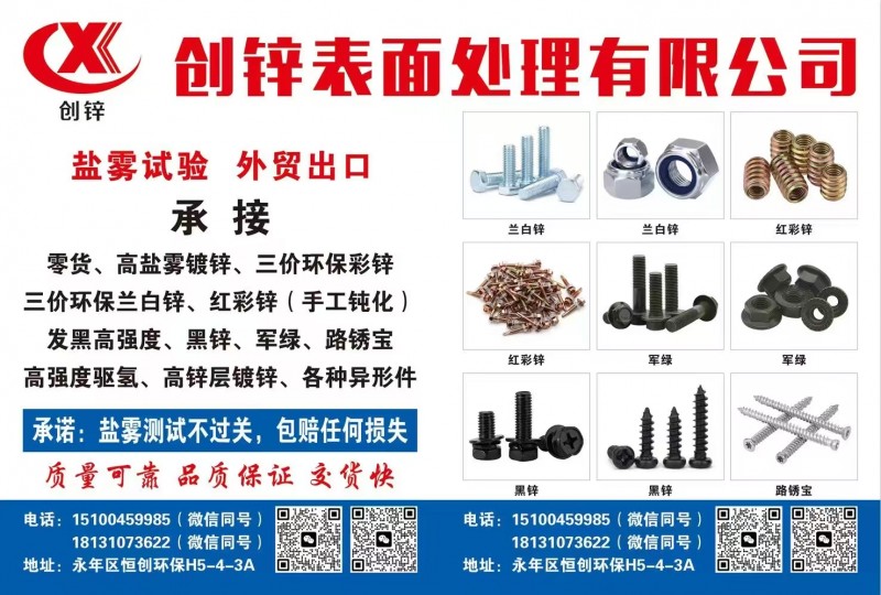 H5-4-3A,承接:高盐雾试验,三价环保彩锌/蓝白锌,高强度紧固件镀锌(8.8级/10.9级/12.9级),手摇彩锌钝化,黑锌,军绿,零货。(不伤扣)