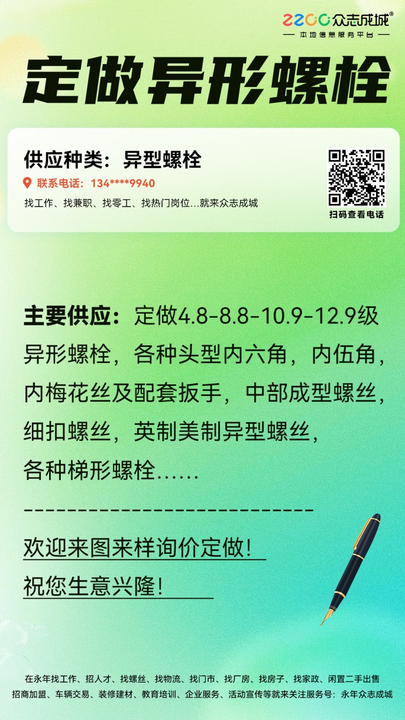 主营:定做4.8-8.8-10.9-12.9级异形螺栓,各种头型内六角,内伍角,内梅花丝及配套扳手,中部成型螺丝,细扣螺丝,英制美制异型螺丝,各种梯形螺栓……