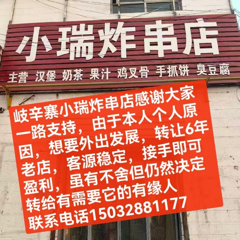 岐辛寨小瑞炸串店,由于本人个人原因,想要外出发展,转让6年老店,