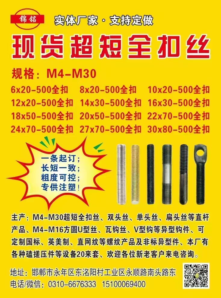 主产:M4-M30超短全扣丝、双头丝、单头丝、扁头丝等直杆