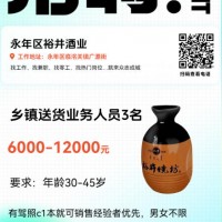 永年区裕井酒业招聘:城内业务人员5名待遇从优!年龄:30至45岁(男女不限) 有经验者优先,薪资待遇:4000元.具体面议 联系人:王主管